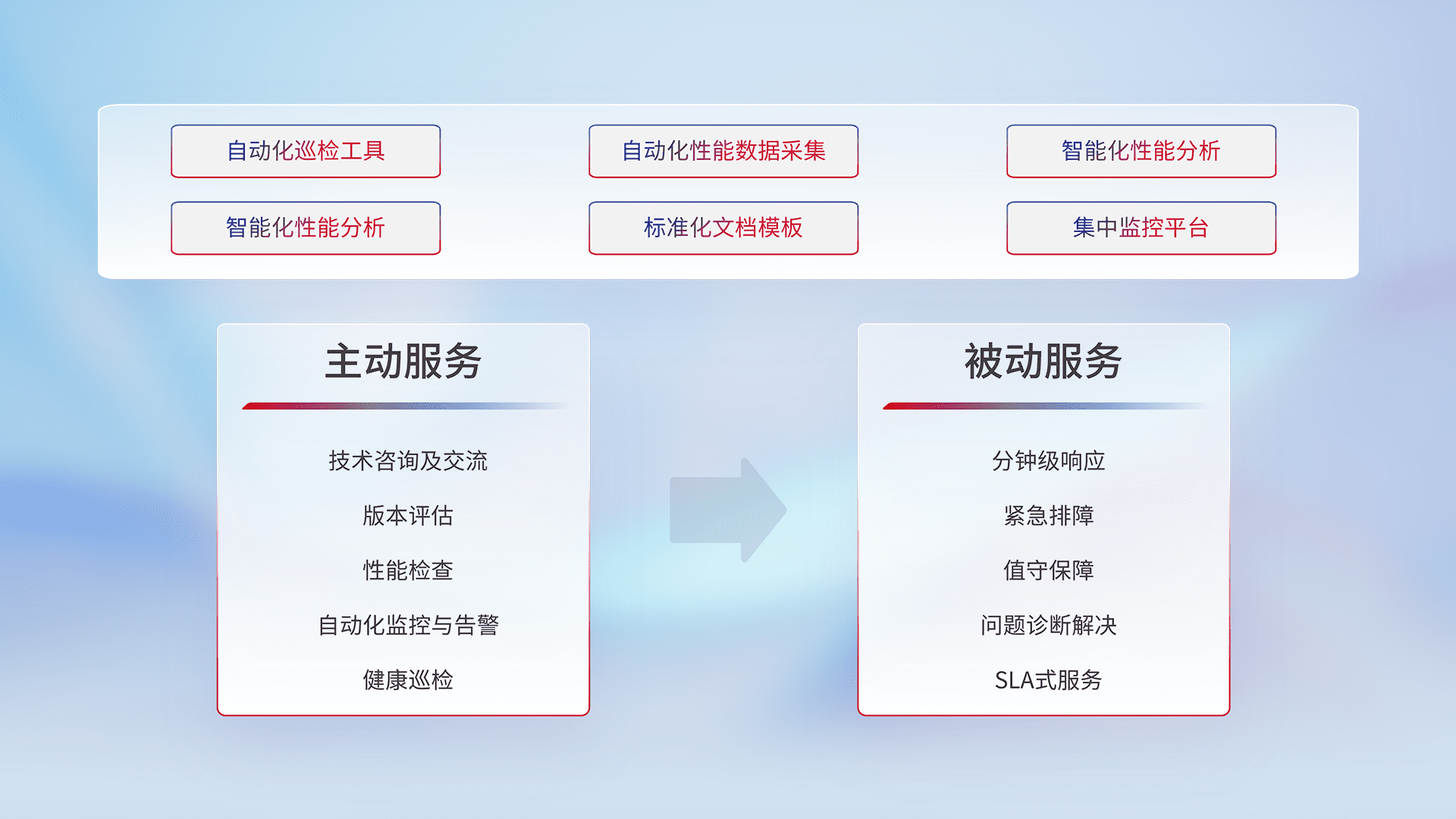 智能化工具和标准化文档,,保障服务质量,,,,提供主动服务(包含技术咨询、、、版本评估、、性能检查、、自动化监控与告警、、健康巡检)和被动服务包含(分钟级响应、、、紧急排障、、值守保障、、、问题诊断解决、、、、SLA服务)。。。