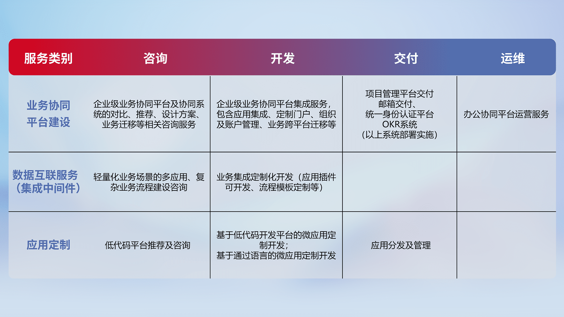 针对钉钉、、、、企微、、、IDaas等平台级产品提供产品的规划、、、、方案、、交付、、、、定制化开发等服务,,,实现如统一协同办公、、、、智能客户服务、、、、混合会议管理、、智能数据查询、、、等业务场景,,实现数字化转型。。。